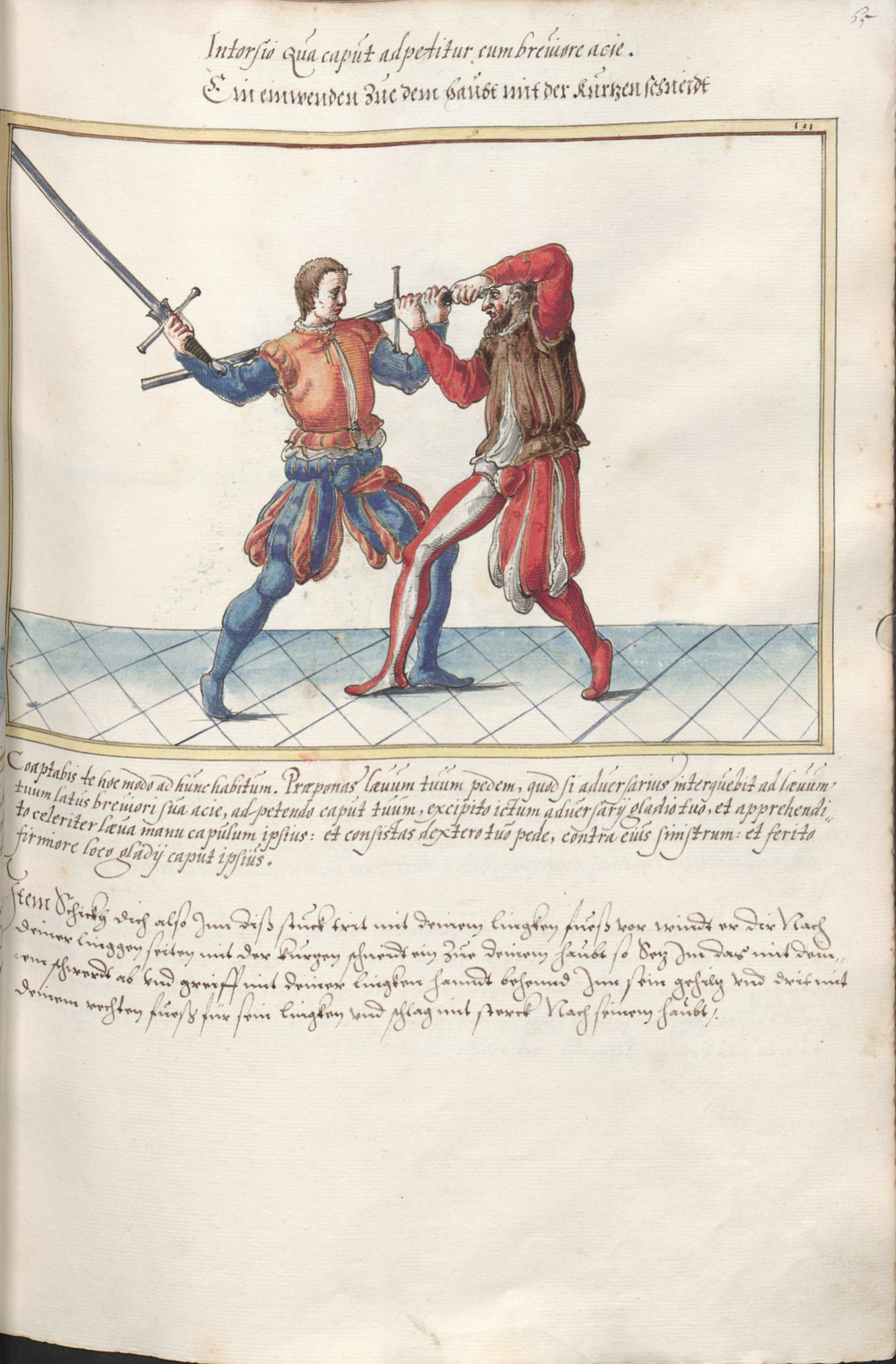 Item Schickh dich also Inn diß stuck trit mit deinem lingken fueß vor windt er dir Nach deiner linggen seiten mit der kurzen schneidt ein zue deinem haubt so Sez Im das mit deinem schwerdt ab und greiff mit deiner lingken hanndt behennd Inn sein gehilz und trit mit deinem rechten fueß für sein lingken und schlag mit sterck Nach seinem haubt /.