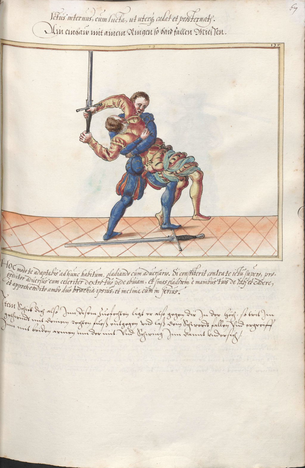 Item Schick dich also Inn disem Zuefechten ligt er also gegen dir In der höch, so trit Im geschwindt mit deinem rechten fueß entgegen und laß dein Schwerdt fallen Und ergreiff Inn mit beiden armen inn der mit. Und Schwing Inn damit undersich.