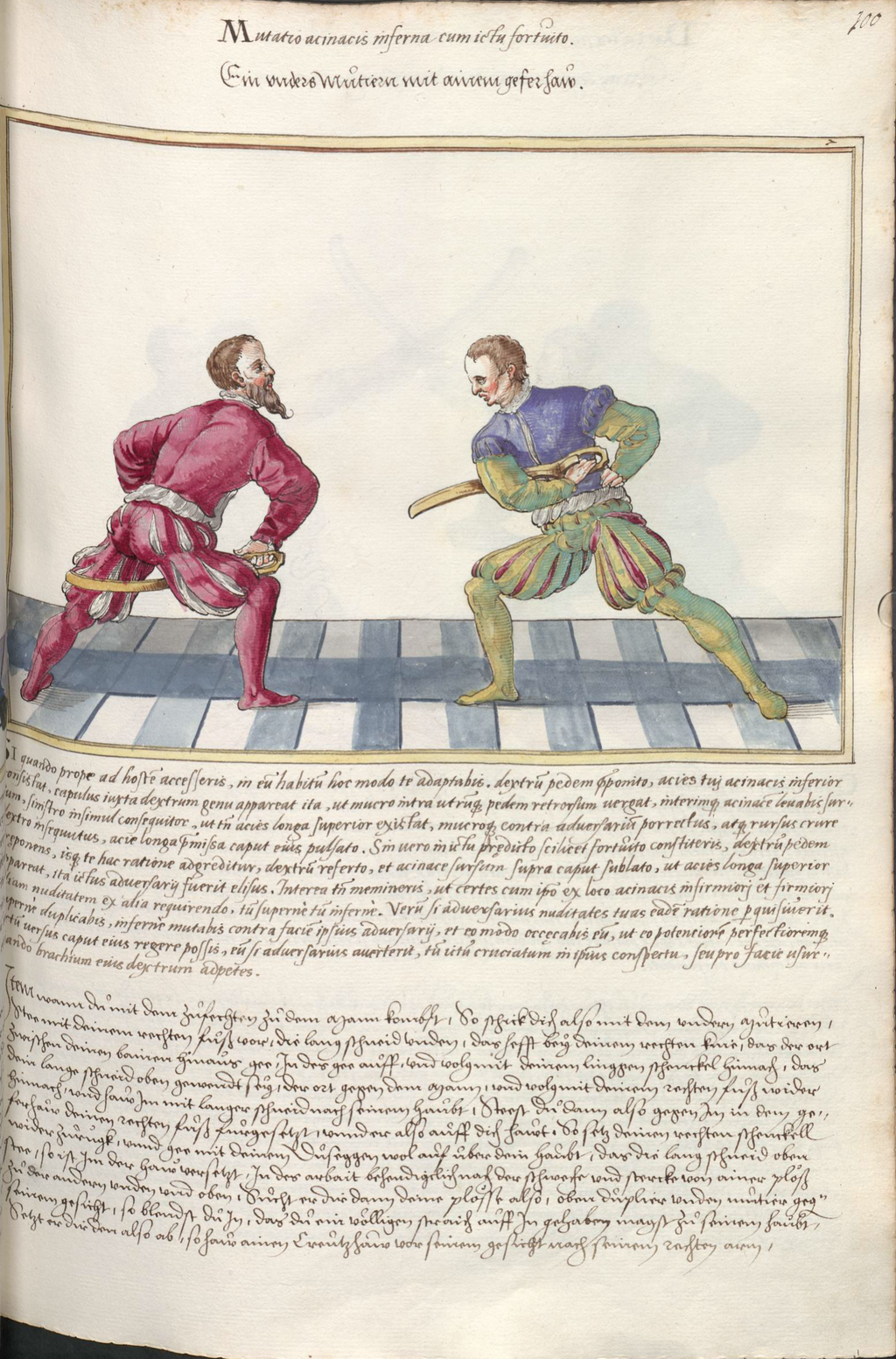 Item: wann du mit dem zufechten zu dem man kumpst, so schich dich also mit dem unndern Mundiern stee mit deinem rechten fuoss vor die lanng schneid unnden das hefft bey deinnem rechten knie das der Ort zwischen deinnen vammen hin auf gee, Indes gee auf und volg mit deinnem lincken schenckel hinnach das dein lannge schneid oben gewenndt sey der Ort gegen dem ajan und volg mit deinnem rechten fuoss wider hinnach und haw Im mit lannger schneid nach seinnem haupt, stastu dann also gegen Im Inn dem Geferhaw deinnen rechten fuoss fur acsezt und er also auf dich hawt, so sez deinnen rechten schennckel wider zuruch unnd gee mit deinnem Duseggen wol auf uber dein haupt das die lanng schneid oben stee sorzst Im der haw versezt, Indes arbait behendiglich nach der schwech und stercke von ainner plosse zu derandern unnden und oben sucht, Er dir dann deinne plosse also oben duplier unden ajundier gegen seinem gesicht so blendstu In das du ain voligen starch aufzn gehaben magst zu seinem haupt, sez er dir den also ab, so haw ainen creizhaw vor seinem gesicht nach seinem rechten arm.