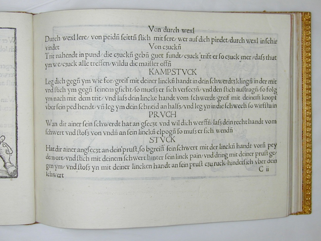 Leg dich gegen ym wie for, greif mit deiner lincken handt in dein schwerdtz klingen in der mit und stich ym gegen seinem gsicht, so muesz er sich verseczen, und den stich austragen, so folg ym nach mit dem trit, und lasz dein lincke handt vom schwerdt, greif mit deinemm knopf uber sein ped hendt, und leg ym dein schneid an halsz, und leg yn in die schwech so wirfstu in