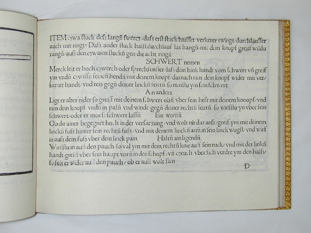 Merck leit er hoch czwerch oder sprechfenster, lasz dein hink handt vom schwert und greif ym unden czwissen seinenn henden mit deinem knopf, darnach nim dein knopf wider mit verkerter handt, und reis gegen deiner lincken seitten, so nimstu ym sein schwert
