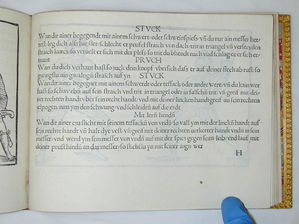 Wan dir ainer begegendt mit ainem schwert, oder schweinspiesz, und du nur ain messer hettest, leg dich alsz hie stet, schlecht er prufel straich von dach, trit in triangel und versecz den straich kurcz, so veruelt er sich mit der plesz, so trit du bhendt nach vud schlag ee er sich ermant