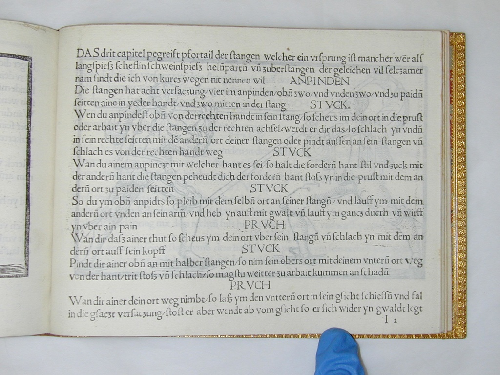 Wen du anpindest oben von der rechten handt in sein stang, so scheus im dein ort in die prust oder arbait yn uber die stangen zu der rechten, achsel, werdt er dir das, so schlach yn unden in sein rechte seitten mit den andernn ort deiner stangen oder pindt aussen an sein stangen und schlach es von der rechten handt weg
