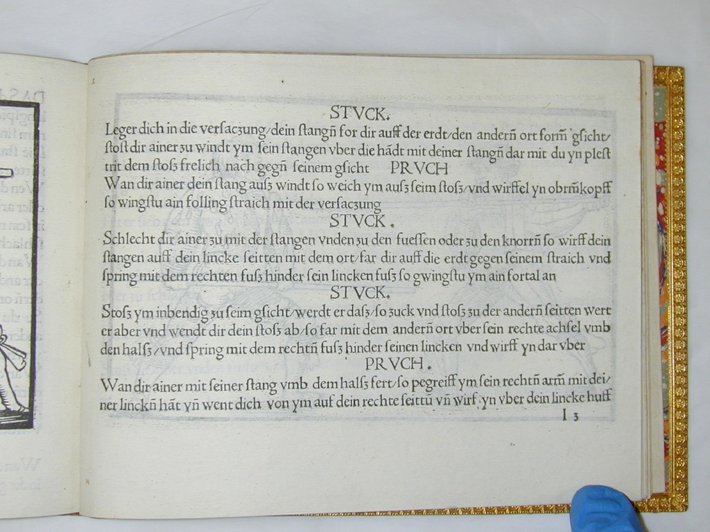 Leger dich in die versaczung, dein stangen for dir auff der erdt, den andernn ort formm gsicht, stost dir ainer zu windt ym sein stangen uber die handt mit deiner stangen dar mit du yn plest trit dem stosz frelich nach gegen seinem gsicht