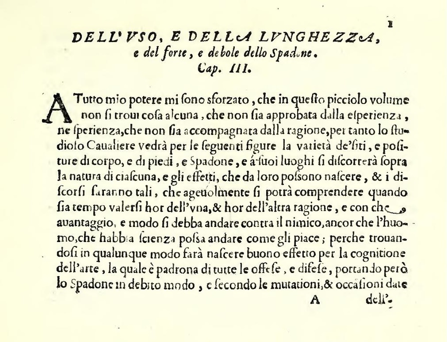 A Tutto mio potere mi sono sforzato, che in questo picciolo volume non si trovi cosa alcuna, che non sia approbata dalla esperienza, ne esperienza, che non sia accompagnata dalla ragione, per tanto lo studioso Cavaliere vedrà per le seguenti figure la varietà de'siti, e positure di corpo, e di piedi, e Spadone, e à suoi luoghi si discorrerà sopra la natura di ciascuna, e gli effetti, che da loro possono nascere, & i discorsi saranno tali, che agevolmente si potrà comprendere quando sia tempo valersi hor dell'una, & hor dell'altra ragione, e con che avantaggio, e modo si debba andare contra il nimico, ancor che l'huomo, che habbia scienza possa andare come gli piace; perchè trovandosi in qualunque modo farà nascere buono effetto per la cognitione dell'arte, la quale è padrona di tutte le offese, e difese, portando però lo Spadone in debito modo, e secondo le mutationi, & occasioni date