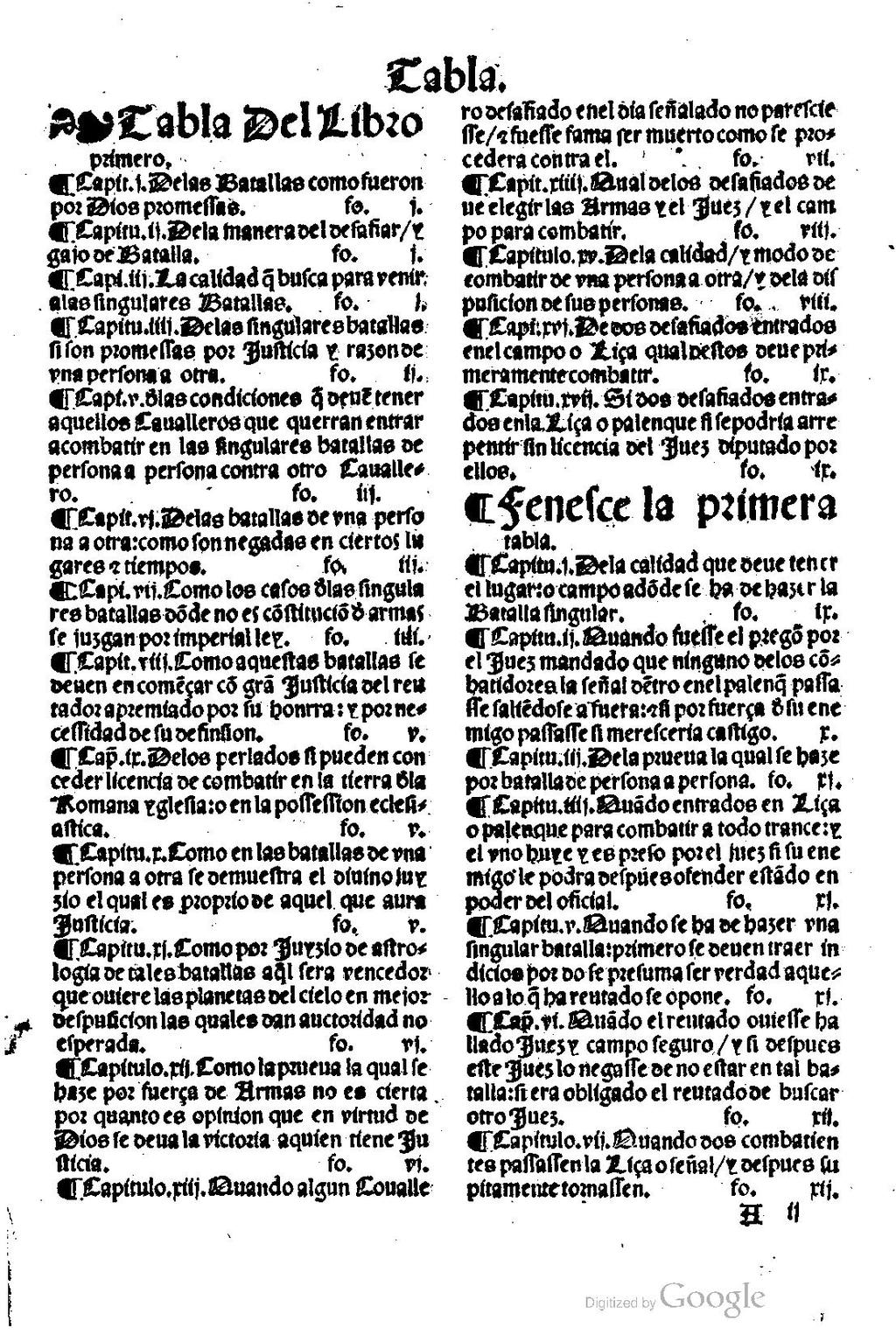 ¶ Capitulo V. Quando se ha de hazer una singular batalla: primero se deven traer indicios por do se presuma ser verdad aquello que ha reutado se opone. folio XI.